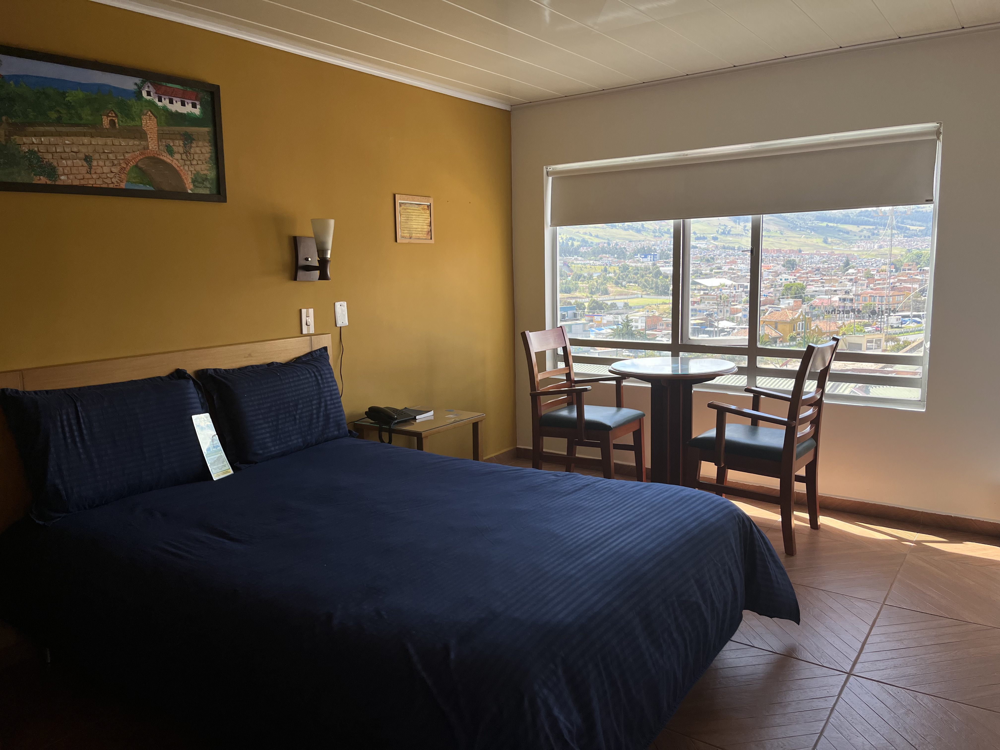 Disfruta de una estadía cómoda y exclusiva en nuestra Suite, un espacio amplio y acogedor con una espectacular vista panorámica de la ciudad. Equipada con una confortable cama king, esta habitación está diseñada para brindar descanso y tranquilidad en un ambiente elegante. Cuenta con amplios ventanales que permiten la entrada de luz natural, mesa auxiliar con sillas ideal para disfrutar del paisaje, baño privado con agua caliente